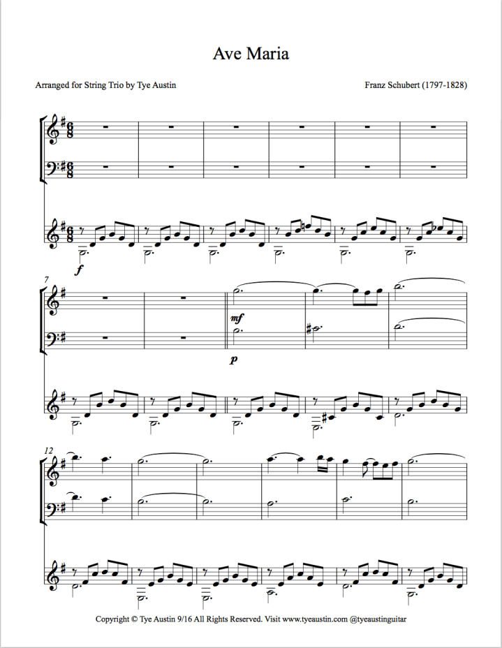 Franz Schubert's Ave Maria is possibly the most popular sacred pieces of music in history. This is Tye's arrangement for string trio (violin, viola, and guitar). Preview/purchase the sheet music and listen to a midi audio recording below.
