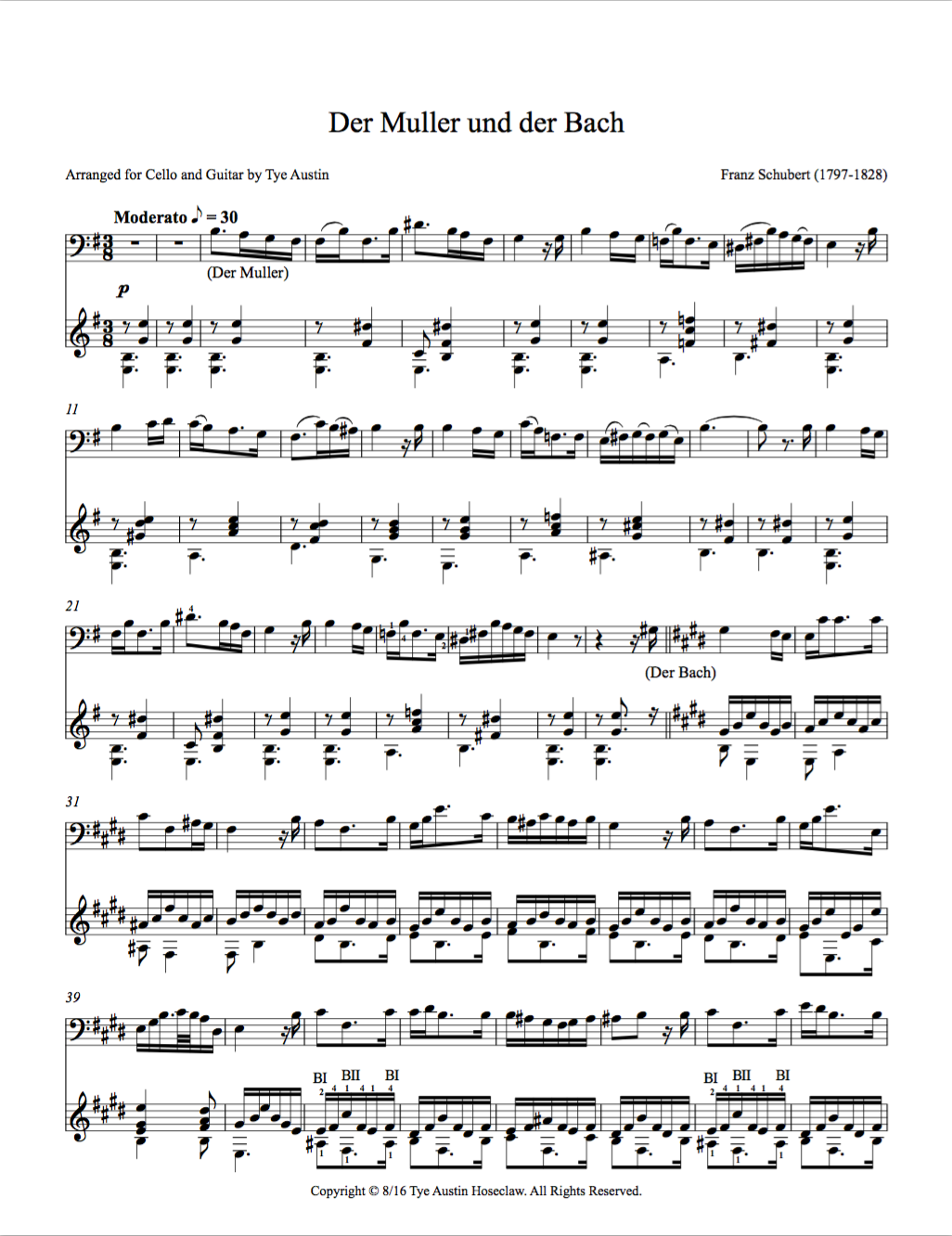 Originally composed for voice and piano by Franz Schubert, this is Tye’s arrangement of Der Muller Und Der Bach for cello and guitar. Preview/purchase the sheet music and listen to a midi audio recording below.